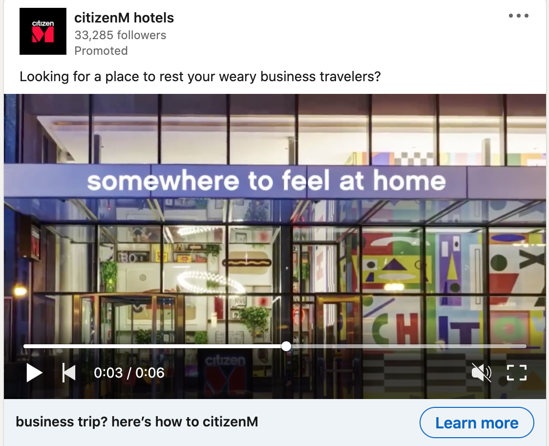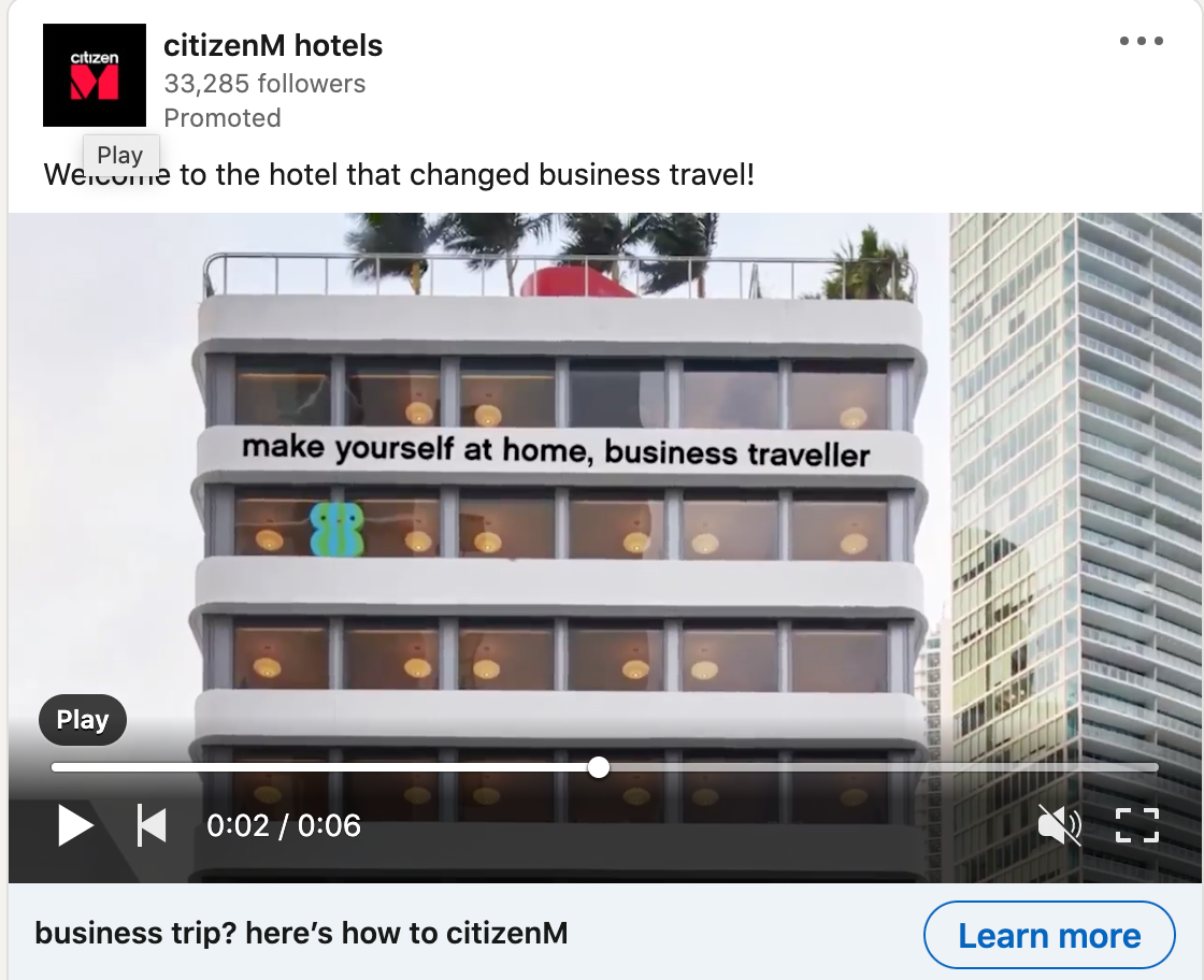We supported citizenM Hotels on their latest B2B LinkedIn campaign aimed at small and medium-sized businesses in the US. For this, we launched a multi-phase campaign to build brand awareness and drive consideration and leads from the relevant target audience. citizenM also wanted us to share key learnings based on the campaign to understand their target audience better.